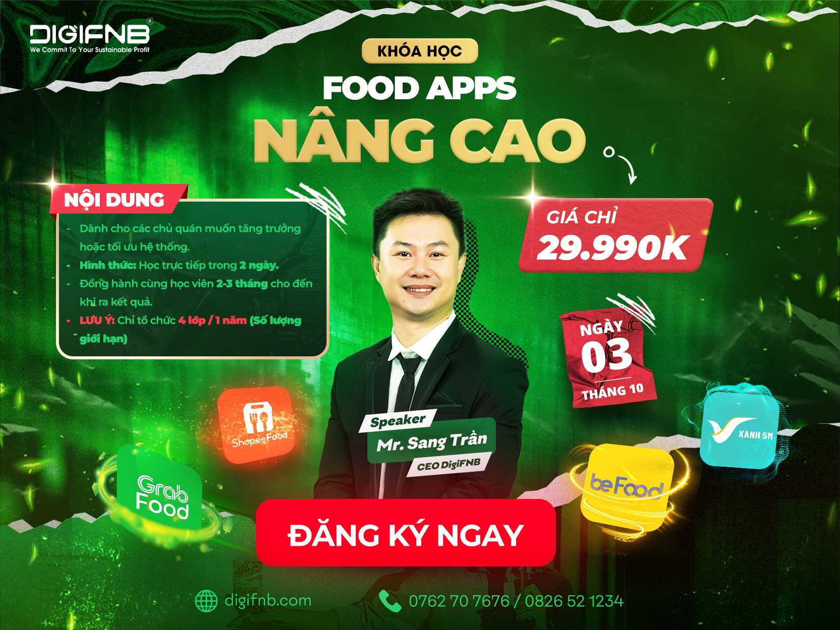 Khóa học “FOOD APPS NÂNG CAO” chính là chìa khóa dành cho bạn. Được thiết kế đặc biệt cho chủ quán ăn, nhà hàng, quán cà phê,.. chương trình mang đến lộ trình 2 ngày học chuyên sâu – 2 tháng đồng hành thực chiến – cầm tay chỉ việc, đây không chỉ là một khóa học, mà là một hành trình lột xác toàn diện để bạn làm chủ cuộc chơi và bứt phá doanh thu.